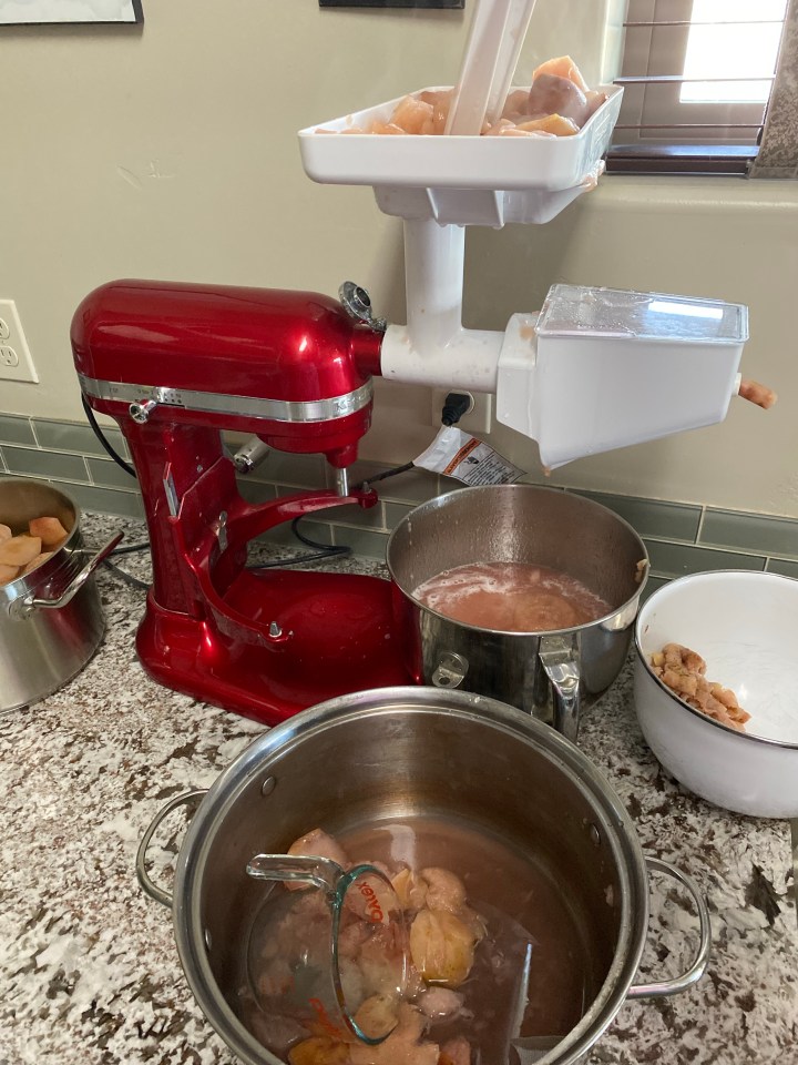 This is the KitchenAid attachment I was talking about. As you can see it is automatic and with the simple flip of the , switch it was delicious apple sauce for you!!. As you can see, I am scooping apples that have been cooked and placing them into the top portion of the processor. Then it will send out the skins and only put the sauce in to the other container. It is quite wonderful!